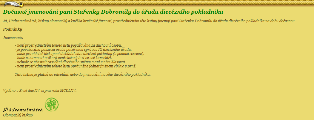 Dočasné jmenování Stařenky Dobromily na pokladníka Olomoucké diecéze